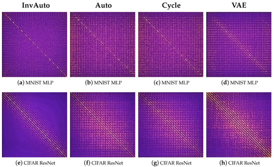 Heatmap of the values of matrix for InvAuto (a,e), Auto (b,f), Cycle (c,g), and VAE (d,h) on MLP and ResNet architectures and MNIST and CIFAR datasets. Matrices E and D are constructed by multiplying the weight matrices of consecutive layers of multi-layer encoder and decoder, respectively, e.g., and for a -layer autoencoder. In case of InvAuto, is the closest to the identity matrix.
