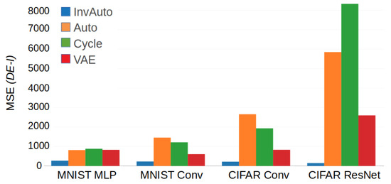 Comparison of the mean squared error (MSE) for InvAuto, Auto, Cycle, and VAE on MLP, convolutional, and ResNet architectures and MNIST and CIFAR datasets. Matrices E and D are constructed by multiplying the weight matrices of consecutive layers of encoder and decoder, respectively.