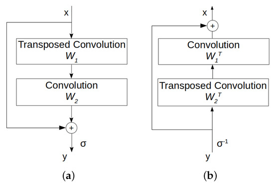 Consider transformation of an input image performed by an arbitrary convolutional layer of an encoder E. Let x denote this layer’s vectorized input image and y denote corresponding output. 2D convolution can be implemented using matrix multiplication involving a Toeplitz matrix [28]. Toeplitz matrix is obtained from the set of kernels of the 2D convolutional filters. Thus, transformation and its inverse can be explained with the same equations as the ones used before, Equations (2) and (3), however, now W is a Toeplitz matrix. We will again parametrize the counterpart layer of the decoder with a transpose of a Toeplitz matrix W. The transpose of the Toeplitz matrix is in practice obtained by copying weights from the considered convolutional layer to the counterpart decoder’s layer that is implemented as a transposed convolutional layer (also known as a deconvolutional layer). Therefore, as before, we enforce the counterpart decoder’s layer to perform transformation and by appropriate training ensure .