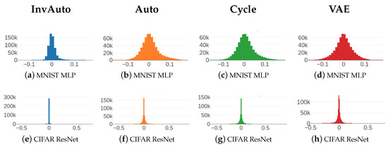 The histograms of cosine similarity of the rows of E for InvAuto (a,e), Auto (b,f), Cycle (c,g), and VAE (d,h) on MLP and ResNet architectures and MNIST and CIFAR datasets.