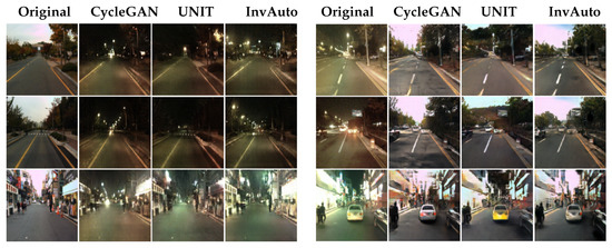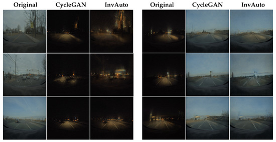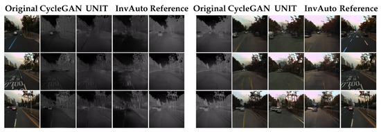 To test the quality of the image-to-image translations obtained by InvAuto, we use the NVIDIA evaluation system for autonomous driving described in detail in [31]. The system evaluates the performance of an already trained NVIDIA neural-network-based end-to-end learning platform for autonomous driving (PilotNet) on a test video using a simulator for autonomous driving. The system uses the following performance metrics for evaluation: autonomy, position precision, and comfort. We do not describe these metrics as they are described well in the mentioned paper. We only emphasize that these metrics are expressed as a percentage, where corresponds to the best performance. We collected the high-resolution videos of the same road during the day and night from the camera inside the car. Each video had ∼45 K frames. The pictures were resized to resolution for the conversion and then resized back to the original size of . We used our domain translator as well as CycleGAN to convert the collected day video to a night video and also the collected night video to a day video (Figure 9). To evaluate our model, we used the aforementioned NVIDIA evaluation system, where the converted videos where used as testing sets for this system. We report results in Table 4.