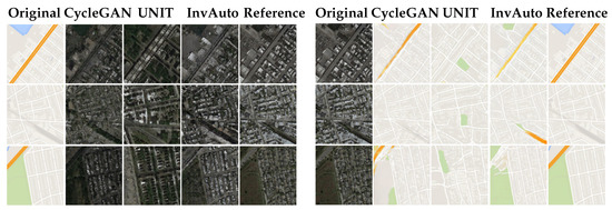 (Left) Maps-to-satellite image conversion. Zoomed image is shown in Figure A9 in Appendix A. (Right) Satellite-to-maps image conversion. Zoomed image is shown in Figure A10 in Appendix A.