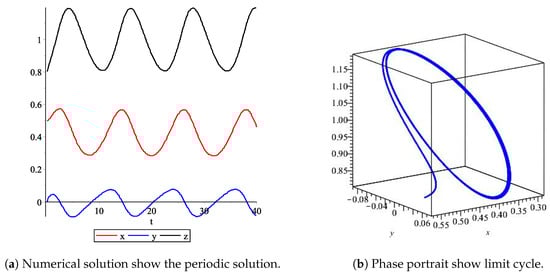 From the result in Section 4, when , we will obtain and the critical value of is . This condition is the fractional order Hopf bifurcation and where periodic solution should be occurred. Perturbate the adjustable control parameter which leads to the dissolve of limit cycle to unstable or stable condition. For the sake of simplicity when doing the simulation, we take and the initial condition as . Figure 1 shows the periodic solution for the time series solution while the phase portrait of the trajectories with the initial condition shows the limit cycle appeared.