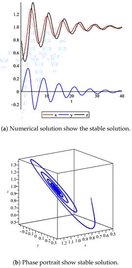 In this section, we will present some simulation of the stability analysis for the system Equation (1). For the simulation purpose, we applying generalized Adams-Bashforth-Moulton type predictor-corrector scheme for solving fractional differential equations developed in []. This numerical approach is widely used in the study of the dynamical behaviour of fractional dynamical system, such as in [,]. This is because most of the system of fractional differential equation or fractional dynamical system do not have analytical solution. Furthermore, we had also modified this approach for solving differential equation in Caputo-Fabrizio sense as in [].