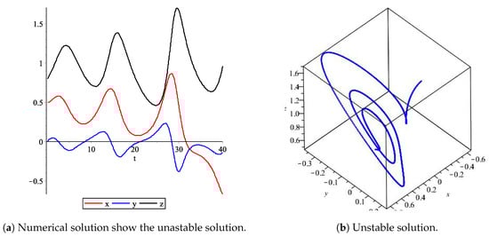 For illustration purpose, we take , the range of must be in order to get the stable solution. If the range of do not lie in that interval, the equlibria will be locally asymptotically not stable. We verified it through simulation for as in Figure 3. All the calculations have done by using Maple.