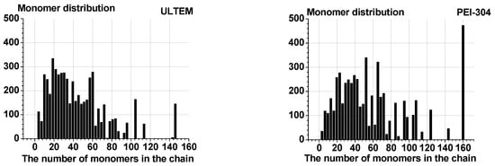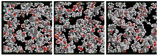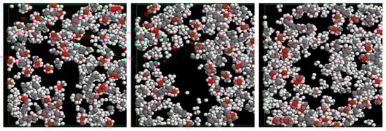 - Random polymerization with the avoidance of cyclic formation and relaxation of the system within 1 ns. For this purpose, at each step of molecular dynamic calculation during this process, the end atoms of the monomer or already synthesized oligomer that were located closer than critical distance were connected via a harmonic potential and the forces arising at the same time begin to draw them together. One of the key parameters regulating the polymerization process is a critical distance which gradually increased from 4 Å at the beginning of polymerization process to 12 Å at the end. The polymerization process was considered successful if the degree of polymerization in the model exceeded the specified value (in this case it was more than 20). Upon completion of polymerization, new lists of valent communications for the synthesized polymeric systems were made. A high temperature (800 K) was chosen to increase the mobility of molecules and to increase the probability of approaching the unreacted ends of different molecules.