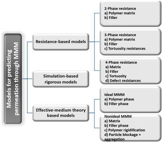 Permeation models through MMMs are usually based on theories developed for thermal/electrical conduction of heterogeneous media due to the analogy between permeation and conduction through composite materials. Three approaches have been used for modeling permeation through MMMs: The resistance-based models, effective-medium theory-based models and simulation-based rigorous models (Figure 1).