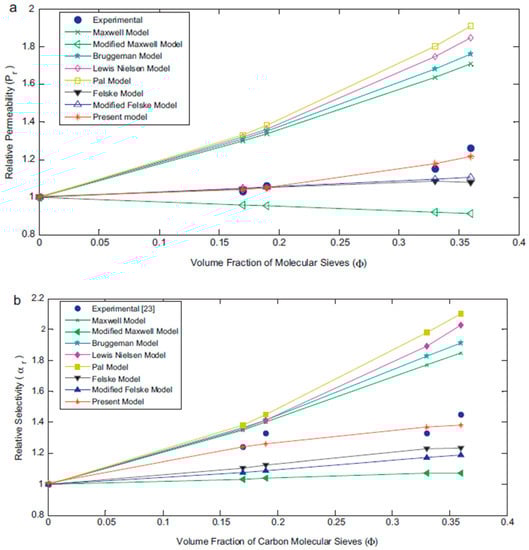 Comparison of the theoretical (a) permeability and (b) selectivity predicted from different models with the experimental data of CO2 and CH4 in carbon molecule sieves (CMS)/Matrimid MMM. Reproduced with permission from Ref. [] Copyright 2011 Elsevier.