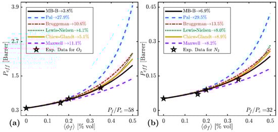 Comparison of experimental and theoretical (a) O2 (b) N2 permeabilities predicted from different effective medium theory based models for CMS/Ultem MMM. Adapted from Ref. [].