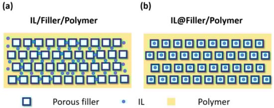 Structures of MMMs with ionic liquid (IL) and porous metal organic framework (MOF) fillers: (a) Free IL dispersed in filler/polymer matrix, (b) IL confined in the porous MOF fillers. Reprinted from Ref. [] with permission from Elsevier.