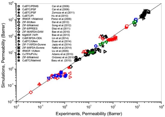 Comparison of our molecular simulation results with experimentally measured H2 (green), CH4 (blue), CO2 (black) and N2 (red) permeability of MOF-based MMMs. Reprinted from ref. [] with permission from Wiley.