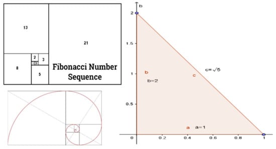 Figure 3 provides a visual representation of the above two equations that define the Golden Ratio as the ratio of the hypotenuse of an isosceles triangle to its base. The Golden Ratio has many interesting properties as shown in Figure 3. Such a visual representation facilitates in active learning and retention, since students can understand its implications visually when the size of data grows. For instance, as the value of  increases, the rate at which  increases can be projected as a graph for the visual interpretation of the Fibonacci function. The teaching team employed suitable software tools for providing such visual representations of numerical concepts and data. These techniques helped the students to apply mathematics to data analytics with data visualization.