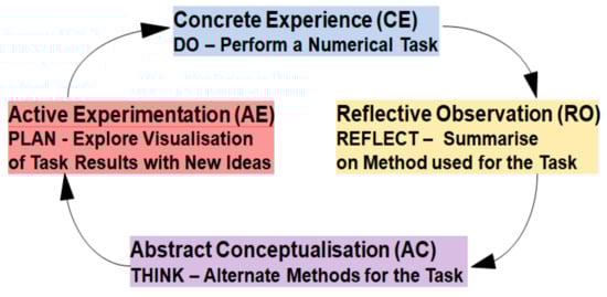 From the literature, it is evident that each person’s learning style differs, displaying different approaches to learning in a higher education setting []. There are mainly four different learning modes: Concrete experience (CE), reflective observation (RO), abstract conceptualization (AC) and active experimentation (AE). Based on these four learning models, we propose an experiential learning framework to incorporate innovative learning activities using visual aids available in the software tools.
