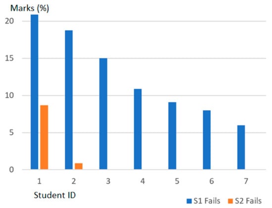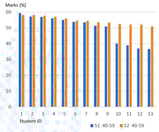 Student performance in the subject was monitored, and performance results at the end of each semester for Cohort 1 and Cohort 2 were compared. Overall, there was an improvement in the grade results obtained by the Cohort 2 students (S2) as compared to the Cohort 1 students (S1), as shown in Figure 5. We compared the performance of students who are low achievers (who scored below average, less than 60 marks). Figure 6 shows that the low achievers of S2 performed better than those from S1.