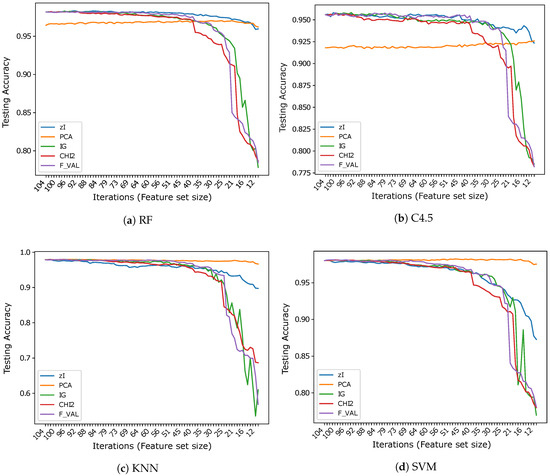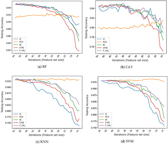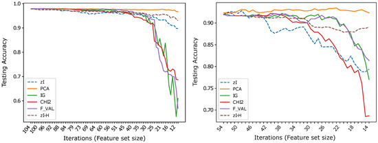 In particular, for each iteration, we collected and plotted the classification accuracy along the y axis of a 2D graph and the size of the feature set (decreasing) or the iteration number (increasing) along the x axis.