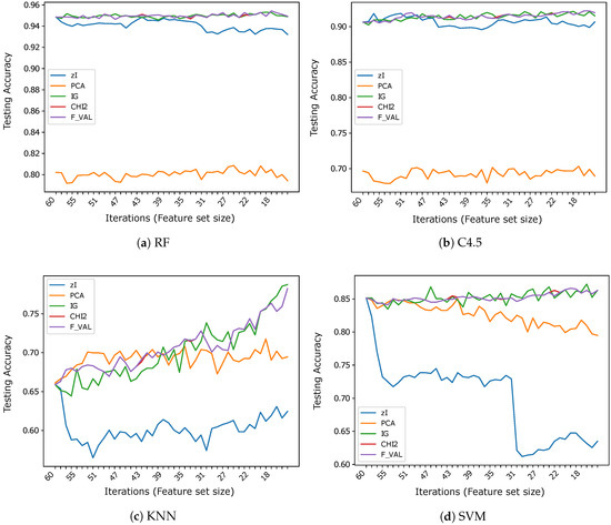 Regarding the results which can be obtained using K-NN or SVM classifiers on , the same considerations can be made about the performance of feature extractors versus feature selectors. The accuracy of IG, , and F_VAL is virtually the same as with RF and C4.5 and the critical thresholds under which their performance decreases is also the same. PCA also works as well as before, offering performance that is virtually constant with all feature set sizes, up to the minimum number we considered, which corresponds to the number of sets found in the last iteration of ZIFF. ZIFF, with these classifiers, has a behavior which is intermediate between PCA and the supervised feature selectors, still showing better robustness with respect to feature set size than the latter, but a worse performance than the former.
