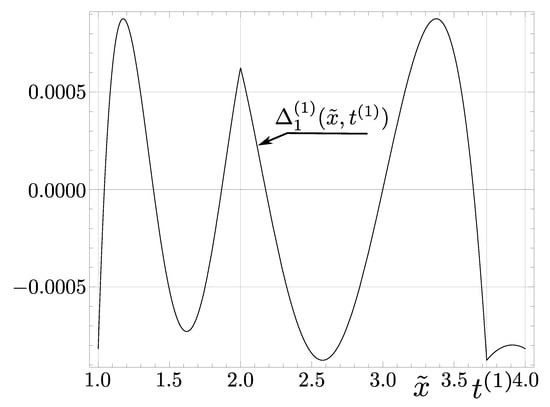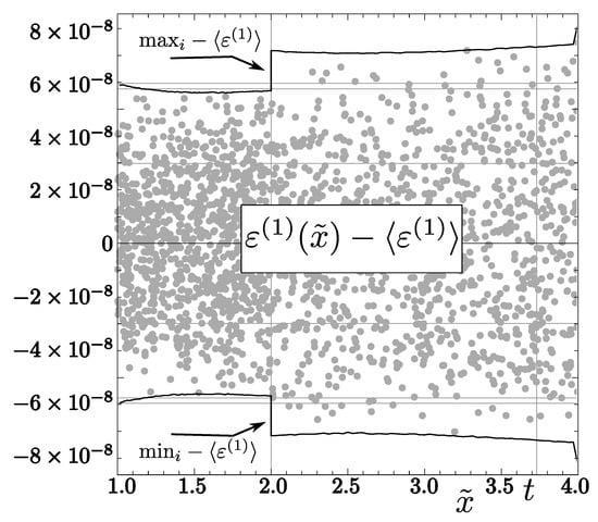 see Figure 3. The blur parameters of the function show that the main source of the difference between analytical and numerical results is the use of precision float and, in particular, rounding of constant parameters of the function . We point out that in this case, the amplitude of the error oscillations is about greater than the amplitude of oscillations of (i.e., in the case of ); see the right part of Figure 2 in []. It is worth noting that for the first Newton–Raphson correction, the blur is of the same order, but due to a much higher error value in this case, its effect is negligible (i.e., Figure 1 would be practically the same with or without the blur). The maximum numerical errors practically coincide with the analytical result (53), i.e.,