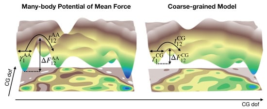 where .  is the probability that an atomic configuration is mapped to a particular CG configuration. By solving Equation (4) for the CG potential, we recover a special potential energy function, , which is known as the many-body potential of mean force (MB-PMF). An equivalent consistency criterion can be imposed for the distribution of CG momenta, , which is automatically satisfied for certain forms of the mapping functions  [].