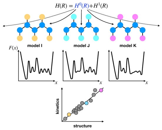 Illustration of a high-throughput-inspired investigation to identify structural–kinetic relationships. First, a Hamiltonian is defined with fixed () and variable () terms. Various models are then constructed by varying the parameters of . The resulting FELs are then investigated (e.g., using kinetic networks as a proxy for the features of the landscape) to identify features that are preserved due to the physical components that are present in every model (i.e., ). Finally, structural–kinetic relationships are identified by finding correlations between various properties.