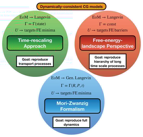 The last 5–10 years have seen a noticeable shift towards developing dynamically-consistent CG models, including: (i) the development of advanced Mori–Zwanzig-based methodologies for applications without clear time scale separation; (ii) the repurposing of well-known thermodynamic–kinetic relationships for time rescaling of diffusion processes in liquids; (iii) the identification of structural–kinetic–thermodynamic relationships for interpreting the conformational dynamics of macromolecules; and (iv) the utilization of kinetic models to characterize and correct the hierarchy of long time scale kinetic processes (see Figure 3 for a schematic overview of these approaches).