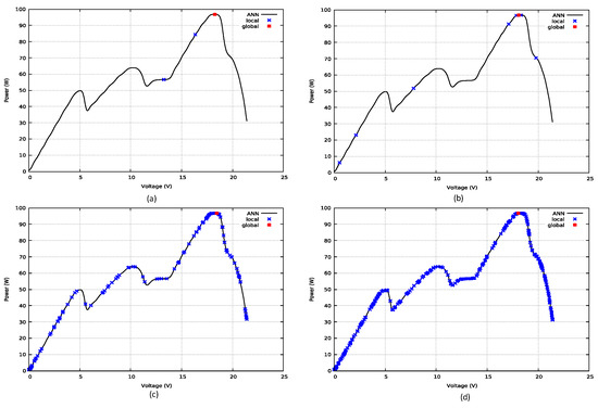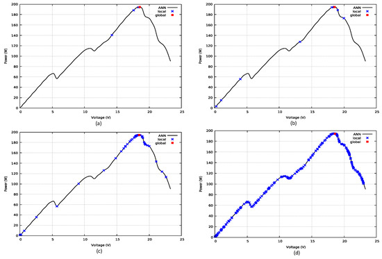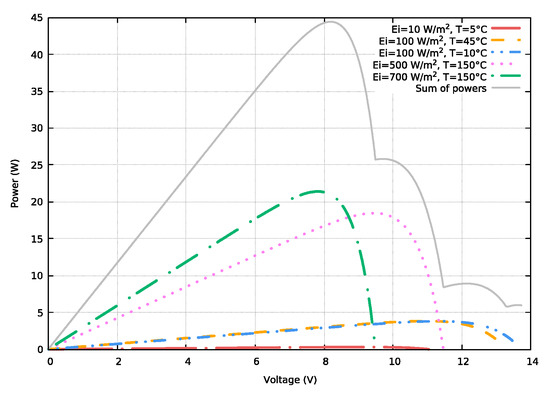 One of these situations is partial shading that occurs in photovoltaic (PV) modules [6]. Objects interfering with the solar irradiance on the surface of the PV module cause that in the characteristic curve that usually has a single global maximum [6,7,8], there are multiple local maxima [9,10,11]. This situation makes it difficult to implement maximum power point tracking (MPPT) controllers [12,13,14]. All these circumstances cause power losses and therefore inefficient system performance.