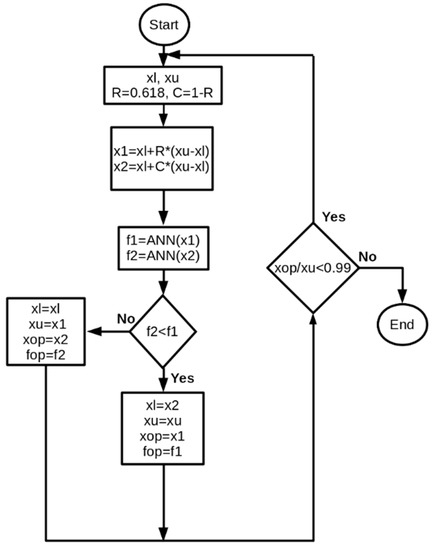 The flowchart begins with the initialization of the search range xl and xu, and the first solutions x1 and x2 are evaluated, where R is the golden number and C is its complement.