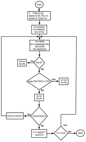 This algorithm is composed of two stochastic processes: One for the generation of solutions and another for the acceptance of that solutions, if they meet the criteria described in Equation (9), which is controlled by Equation (10). See Figure 4.