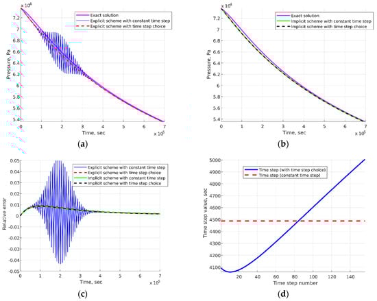 where constants  and  depend on initial pressures (on the left and right boundaries) and constant  is for the initial time value. Initial and boundary conditions for the difference scheme are chosen in accordance with the aforementioned solution. The comparison (Figure 1) of implicit difference schemes with (the time step choosing) and without (the constant time step) continuous symmetry groups from Table 1 shows almost no difference in numerical solutions. The comparison of explicit difference schemes shows that the time step choice (the case with continuous symmetries) from (23) helps to stabilize the explicit difference scheme (21) with the same number of constant time steps (the case without continuous symmetries). Table A3 and Table A4 show errors for different methods and meshes.