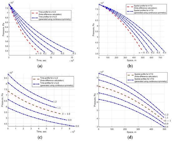 Numerical solution generations for the solution (Figure 1) obtained using the implicit scheme with the time step choice. Plots (a,b) show generations using dilations for time and spatial variables (infinitesimal operator ) with certain values of the group parameter ; plots (c,d) show the applications of , which defines dilations of time and the combination of dilations and translations for pressure (the set initial left boundary pressures define group parameters for generations, where k is the factor for  ).