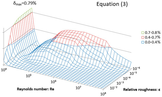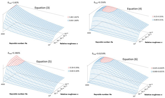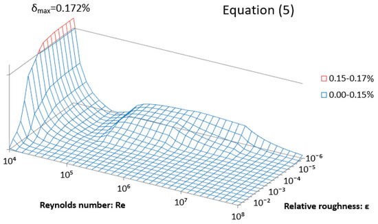 Compared with analysis performed in MS Excel where 740 points are used, analysis with 2 million quasi Monte-Carlo points using the Sobol sequence detected additional peaks of error, as shown in Table 2. The same value of the maximal error is detected for even 2000 quasi Monte-Carlo points. Thus, this analysis confirms that the Sobol sequence of 2 million quasi Monte-Carlo points sufficiently covers the whole domain. For example, for Equation (6), the largest relative error is detected for the input pair Re = 5263 and = 3.1707 × 10−7, which corresponds to the zone with lower Reynolds numbers. Although this input pair is not shown in Figure 2, Figure 3, Figure 4 and Figure 5, the figures clearly indicate a tendency towards higher relative errors when the Reynolds number and the relative roughness of the inner pipe surface are smaller.