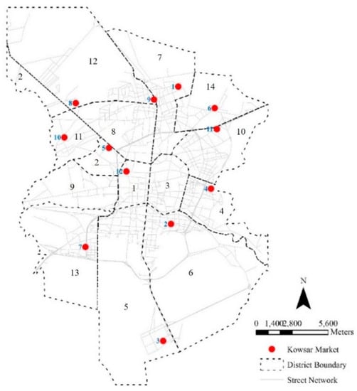 Access to high quality and healthy foods is crucial for city residents, particularly for low- and middle-income families. [68,76]. In this way, the municipality of Isfahan constructed 12 Kowsar discount retail markets to supply the needs of people in the city of Isfahan, Iran. In doing so, assessing the accessibility of TAZs of Isfahan was taken into account to test the applicability of the model in a real-world problem. Figure 1 depicts the study area along with distribution of the markets.