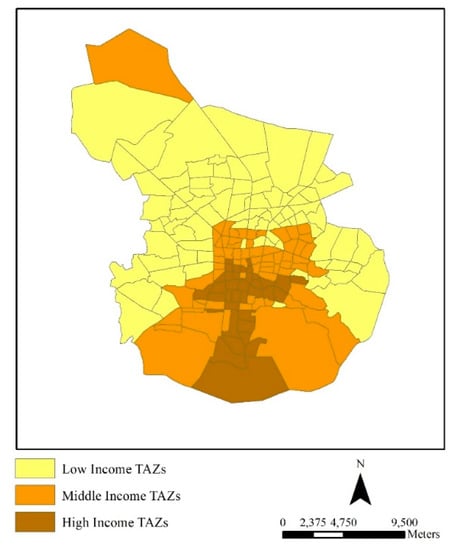 Moreover, it could be observed that northern TAZs had larger access to the markets than the southern ones. In addition, comparing accessibility values achieved by NNRNTPs with the income of people living in TAZs portrayed that low-income TAZs had larger values than the others (Figure 3).