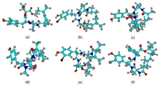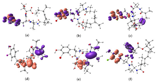The lobe positions in each case indicate where the electrophilic and nucleophilic regions within the peptides are located, the darker ones being those belonging to < 0 and the clearer ones corresponding to > 0. This depends on the molecular structure and the electronic density that results from it. For the studied peptides, these regions were mainly located around the phenyl rings. It can be seen in Figure 2 that different substituents exerted important influence for the I, Cl, and Br atoms in Seragamides A–C, respectively, the addition of a second phenyl ring in Seragamide F, or a CHOH group in Seragamide E.
