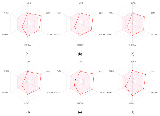 Bioavailability Radars of: (a) Seragamide A; (b) Seragamide B; (c) Seragamide C; (d) Seragamide D; (e) Seragamide E; and (f) Seragamide F.