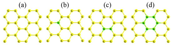 where E(C24) and E(C24-qNq) are the energies of pristine (Figure 1a) and doped (Figure 1b–d) graphene periodic cells; E(C) and E(N) are the energies of carbon and nitrogen atoms, respectively; and q is the number of nitrogen atoms in the unit cells (q = 1, 2, or 6).