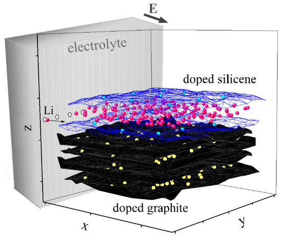 Sheets of silicene with a floral structure [5] were arranged horizontally one above the other. The unit cell of silicene had a rhombic shape and contained 18 atoms, 6 of which were elevated relative to the basal plane [33]. The sheets of silicene were oriented with respect to each other so that the protrusions on their surfaces were facing outward. The calculations were performed for six hg gaps between the sheets of silicene, with an initial value of 0.24 nm and a final value of 0.75 nm. The value hg = 0.24 nm was determined in the DFT calculations as a gap in two-layer free-standing silicene [34]. The gap hg = 0.75 nm was used to study the intercalation/deintercalation of lithium in a silicene channel on metal substrates [5,6,7]. The remaining hg values were separated from each other by a distance of 0.1 nm. The lithium atoms in the channel with the gap hg = 0.75 nm could move quite freely along the channels located on the metal (Ag, Al, and Cu) substrates [5,6,7,35]. In the present work, the initial distance between the lower silicene sheet and the graphite substrate was 0.222 nm and corresponded to a similar value determined using the DFT calculations in Reference [36]. The channel did not have material sidewalls but was surrounded by an artificial force barrier, making it difficult for atoms to escape through the side and back surfaces [7]. The model we used corresponded with electrodes in a lithium-ion battery being separated by a solid electrolyte. Through the input (frontal surface), Li+ ions were periodically introduced into the channel at an interval of 1 ps. Ions were introduced one after another and were “drawn” into the channel due to the applied electric field having a strength of 104 V/m. After 1 ps, the Li+ ion entering the channel turned into a lithium atom [7], which subsequently did not “feel” the presence of the electric field. In other words, the intercalation was simulated in the form of ions entering the silicene channel from a solid electrolyte, as is shown in Figure 2. The filling of each channel consisted of 400 starts of Li+ ions. In other words, the intercalation time in the system was 500 ps, or 5 million time steps (Δt = 0.1 fs).