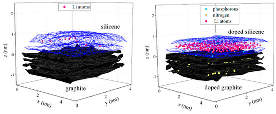 The distance between the silicene sheets (from 0.24 nm to 0.75 nm) was a variable parameter in our study. Cell parameters and the number of Si, C, P, and N atoms remained unchanged. However, the number of Li+ ions intercalated in the channel changed depending on the distance between the silicene sheets. All initial parameters used in the simulation are presented in Table 4.