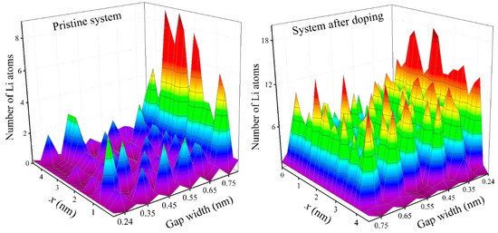 Doping of the system (a silicene channel on a graphite substrate) had a significant effect on the channel filling with lithium. Figure 3 compares the results of the intercalation of lithium into a pristine system and a system subjected to nuclear transmutation doping. In both cases, the initial gap between the sheets of silicene was 0.24 nm.