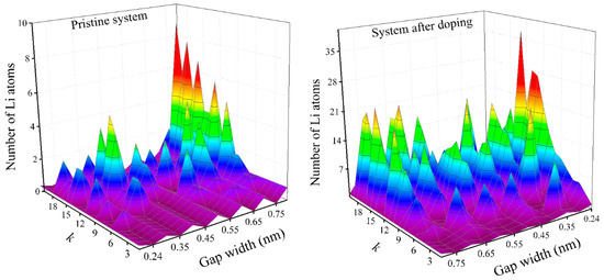 The height distribution of Li atoms in the silicene channels is shown in Figure 5, which presents the altitude density profiles of lithium atoms in unirradiated (left) and irradiated (right) channels. Since the gaps in the channels differed significantly, the display of the density profiles depending on the height values is not expressive. Therefore, an interval equal to the size of the entire gap (divided into 20 sections) on one of the horizontal axes is reflected in Figure 5. Here, the variable k shows the section number. The counting of the sections starts from the bottom sheet of silicene, i.e., bottom–up. This representation allows for a more accurate reflection of the altitude profiles of the distribution of lithium atoms in different channels in the same figure. As can be seen in Figure 5, lithium atoms were mainly located near the upper silicene sheet, almost regardless of the size of the gap in the channel. This was manifested to a greater extent for the case of the unirradiated system, in which the lower part of the channel extended upward almost to hg/2 and was not occupied by lithium. In the irradiated system, the value of the lithium-free region in the channel was somewhat reduced. This arrangement of Li atoms in the channel indicated a significant effect of the carbon substrate on the packing of intercalated Li atoms. This effect was reduced in the irradiated system due to an increase in the adsorption capacity of phosphorus-doped silicene. The uniformity of the distribution of Li atoms in the channel increased slightly with the increasing gap.