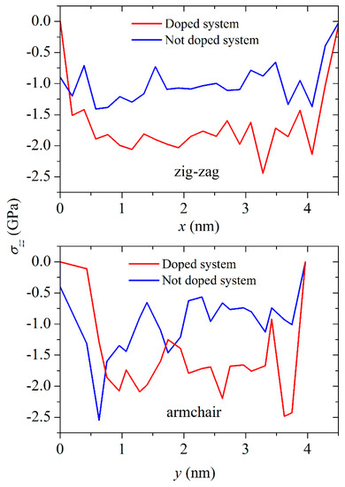 Normal to the channel walls stresses σzz are the most significant both for the channel free of lithium and for the channel filled with this metal. Figure 6 shows the distribution of σzz stresses in the silicene sheets in the zigzag and armchair directions. The stress distributions corresponded with the moment of complete filling of the channel for the narrowest gap (0.24 nm) of lithium both for the undoped and for the doped systems. The stresses σzz were negative due to the corresponding direction of the forces fz that stretched the silicene. As a rule, the absolute value of the stress σzz in the walls of the irradiated silicene channel was higher than that in the walls of the unirradiated silicene channel. This was due to the appearance of additional stresses created by the impurity introduced by NTD. The stress distribution σzz in the zigzag direction was more uniform than in the armchair direction.