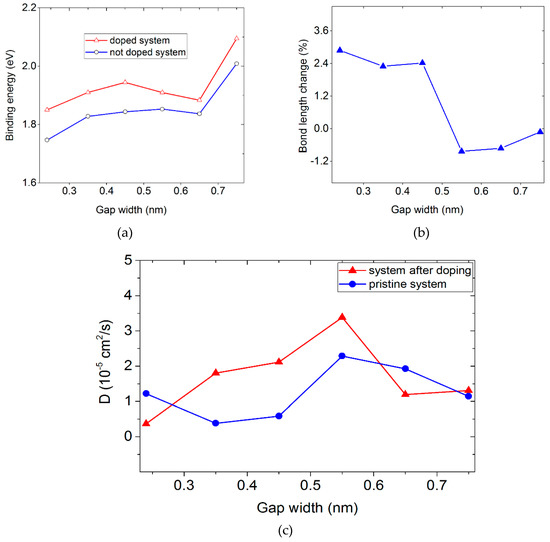 (a) Binding energy, Eb, of Li as a function of channel gap width for undoped and doped systems; (b) change in the Si–P bond length during the filling of a silicene channel with phosphorus-doped walls as a function of the channel gap; (c) coefficient of the self-diffusion of lithium atoms in the silicene channel with undoped and phosphorus-doped walls.