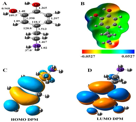 (A) Geometry, (B) molecular electrostatic potential surface (MEP) plot, (C) highest occupied molecular orbital (HOMO), and (D) lowest unoccupied molecular orbital (LUMO) of dopamine (DPM).