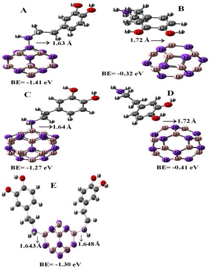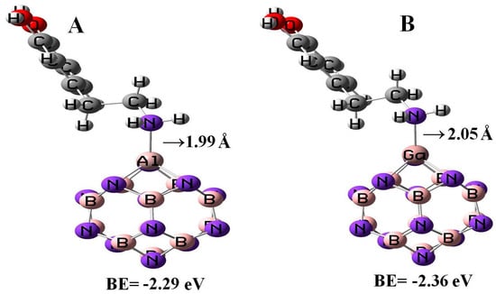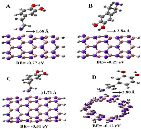 Based on recent reports, nanotubes, nanowires, fullerenes, and nanoparticles are considered as bioconjugated nanostructure materials that have emerged as a new class of materials for biosensing and medical diagnostics implementation [1,2,3,4,5,6,7,8,9]. Carbon nanostructures (C24, C32, C60, and single-wall carbon nanotubes (SWCNT)) are used as nanovectors for drug delivery of anticancer and antitubercular compounds for tremendous medicinal applications [10,11,12]. Recently, many novel properties in several fields of life science including gas storage devices, biological applications, chemical sensors, and drug delivery systems have been reported [13,14,15]. Moreover, nanotubes containing atoms of groups III and V of the periodic table of elements are considered to be a suitable case as a replacement of CNTs. Boron nitride nanotubes (BNNTs) have been comprehensively investigated owing to their structural similarity with carbon nanotubes, holding promises for development in nano-bio systems. Subsequently, numerous experimental and theoretical investigations have been dedicated to considering the electronic properties and different structures of BNNTs. Besides, the BNNTs are considered to be a polar material due to the slight positive charges of boron (B) atoms and the slight negative charges of nitrogen (N) atoms; while there is no polarity in CNTs, this could be a reason to apply BNNTs in electronic and mechanical devices [16,17,18,19]. Dopamine (DPM) or 3,4-dihydroxyphenyl ethylamine exists in the mammalian central nervous system and is an important neurotransmitter, as it plays a pivotal role in communication with neurons [20,21]. Its electrochemical behavior has prominent impacts on its physiological functions which is an essential factor in the diagnosis of some diseases in clinical medicine [22]. For example, the adsorption of isoniazid drug molecule toward the electronic and structural properties of (5,5) and (10,0) BN nanotubes were studied by Deka et al. [23]. They reported that the interaction of drug molecules with (10,0) BNNT is thermodynamically notable in comparison with (5,5) BNNT. Anota and co-workers have shown the adsorption of the biopolymer chitosan upon (5,0) and (5,5) BN nanotubes [24]. It is found that the chitosan adsorption from its amine head attached to the B atom of the (5,0) BN nanotube is stronger than the (5,5) BN nanotube. Pandey and co-workers have an investigation focusing upon the interaction energies between tryptophan (Trp), aspartic acid (Asp), and arginine (Arg) with BNNTs. They inferred that the stabilization of the bioconjugated complexes are primarily indicated for electrostatic interactions. They also found that BNNTs have better sensitivity toward Asp and Arg in comparison to CNTs [25]. They have also performed another study concentrating upon the adsorption phenomena of adenine (A), guanine (G), cytosine (C), thymine (T), and uracil (U) on single-wall boron nitride nanotubes (SWBNNT), finding that the G-SWBNNT system has better adsorption energy than the other adsorption configurations owing to the hybridization of the molecular orbitals of G and the BNNT [26]. In the previous report, we explored the adsorption of adenine, uracil, and cytosine molecules over AlN and BN nano-cages using density functional theory (DFT) calculations [27]. Also, we studied the structure and electronic properties of B12N12 and Al12N12 nano-cages in reaction with caffeine and nicotine molecules, C6H5OH, SCN−, and OCN− by density functional theory [28,29]. The major goal of this study was to evaluate the most stable adsorption sites between the pure or metal-doped BN nanostructures and the DPM using DFT calculations. We also studied the structural, electronic properties, and vibration spectroscopy of the most stable configurations using the B3LYP method and 6-311G** standard basis set.