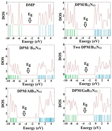 The calculated density of states (DOSs) of the investigated structures revealed that the DPM strongly interacted with B12N12 and B16N16 nano-cages, as shown in Figure 3. All the Fermi levels were at zero. Our calculations of these complexes indicated for strong coupling of the π-charge cloud of the BN nano-cage with that of the DPM. The analysis of DOS revealed dramatic changes owing to the drug adsorption upon B12N12 and B16N16 nano-cages in the gap regions of the total density of state (TDOS) spectrum. However, it could be inferred that the DOS near the HOMO level had the largest change compared with that of the BN nano-cages, so that some local energy levels became visible after the DPM interaction, resulting in the reduction of Eg. The energy gaps of the perfect B12N12 and B16N16 nano-cages were about 6.84 and 6.37 eV, respectively. The Fermi levels of the B12N12 and B16N16 nano-cages were significantly increased from −4.29 and −4.20 eV to −3.13 and −3.14 eV after the adsorption process, respectively, resulting in a charge transfer between the drug molecule and the nano-cage.