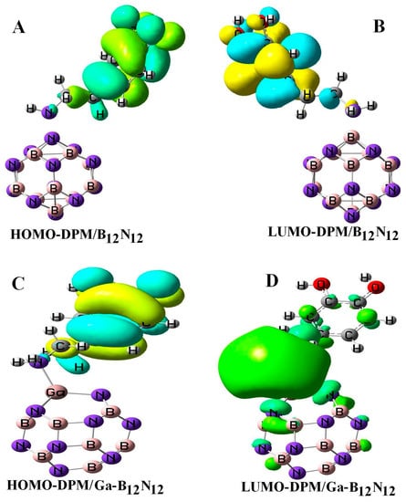 HOMO and LUMO orbitals of DPM over the pure (A,B) and Ga-doped (C,D) B12N12 nano-cages.