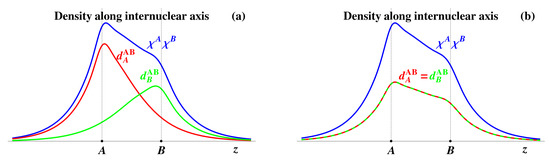 Partition of two-center electron densities, , into atomic fragments , : (a) DAM, (b) Mulliken.