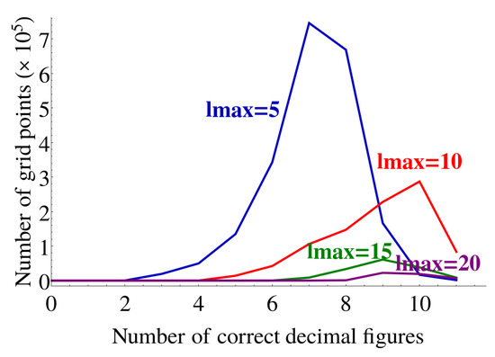 Remarkably, for expansions with or higher, a great amount of points are computed with a high number of accurate decimal figures (twelve or more) as is shown in the last row of Table 1. This can be explained because short-range contributions in most points of the grid (those lying outside the molecular volume) are very small or even negligible, and precision is greatly determined by the convergence of the long-range expansion, i.e., the number of terms in (9), the accuracy in the radial factors playing a minor role.