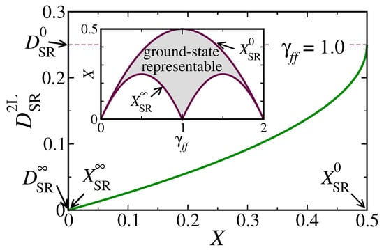 Two-level double-occupation functional of the spin-restricted half-filled Anderson model ( and ) with local impurity occupation as a function of the degree of charge fluctuations X. The values and ( and ) refer to the strongly correlated (uncorrelated) limit. The inset shows the corresponding domain of ground-state representability of (grey area) in terms of and X. Adapted with permission from Reference []. ©American Physical Society.