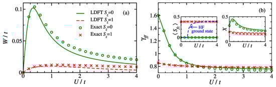 Ground-state and triplet-state properties of Anderson rings having orbitals and electrons as a function of the Coulomb-repulsion strength at the impurity orbital: (a) interaction energy W; and (b) impurity occupation . The insets in (b) show the impurity spin polarization and the degree of charge fluctuations X. Lattice density-functional theory (LDFT) results obtained within the two-level approximation (TLA) (solid and dashed curves) are compared with exact Lanczos diagonalizations (symbols) for and . In the inset of (b) the unrestricted Hartree–Fock results for are given by the dashed blue curve for the sake of comparison. Reproduced with permission from References [,]. ©American Physical Society.