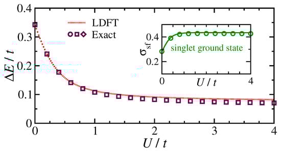 The accuracy of the TLA has been tested by comparing the LDFT results to exact numerical diagonalizations [,]. In Figure 2, one observes that in the whole interaction regime, from weak to strong electron correlations, the TLA yields a quite accurate quantitative description of the physical properties both in the ground state and the lowest-lying spin excitation. The relative errors in , and X are less than , and , respectively, while the absolute error in W is less than . This shows that LDFT with the TLA provides an efficient and physically sound approach to the problem of strong electron correlations. Moreover, Figure 3 shows that the singlet-triplet excitation gap and the degree of spin fluctuations in the singlet ground state, which are both very sensitive to correlation effects, are also quite accurately reproduced. The singlet-triplet gap is particularly interesting since it defines the energy scale which governs the low-temperature physics and is approximately proportional to the Kondo temperature. Concerning , the largest relative error is about . It is also worth noting that in the strongly correlated limit the singlet ground state exhibits a significant local magnetic moment , although the average impurity polarization is strictly zero. This means that the vanishing impurity magnetization is the consequence of spin fluctuations, a subtle indication of spin-charge separation. This contrasts with the usual mean-field approaches, such as the Hartree–Fock approximation, which neglect them and thus lead to an artificial spin-symmetry breaking for sufficiently large (see Figure 2b). Remarkably, the TLA takes correctly into account the fluctuations of a strong local magnetic moment. For these reasons, it provides a simple and accurate tool to describe both ground-state and excited-state properties.
